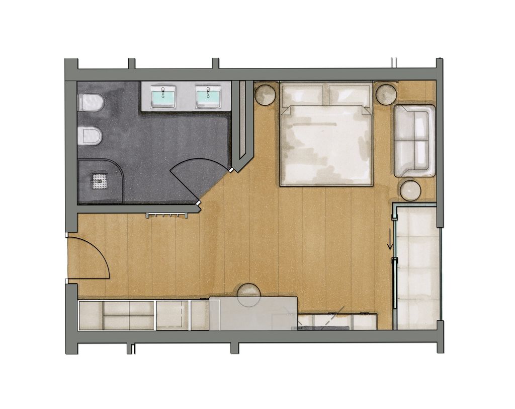 Camera doppia accogliente, arredata in stile moderno. Bellissima vista panoramica sul monte Sole. Esposta verso nord, in parte senza balcone, in parte mansardata. Bagno con doccia/WC. Pavimento in legno. Aria condizionata.