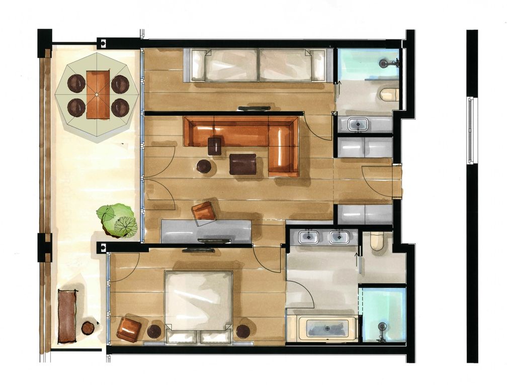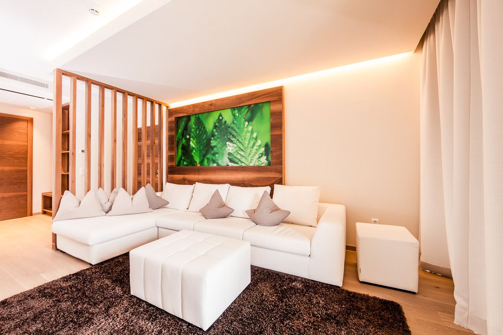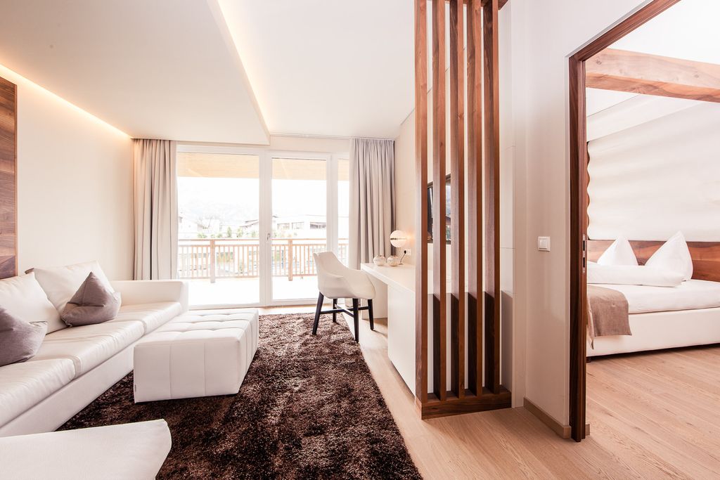 Suite trilocale, ampia e nobile, arredata in stile moderno con colori caldi. Camera matrimoniale e camera doppia separata con finestra e TV. Spazioso soggiorno con mobili di lusso. Atrio con cabina armadio. Due lussuosi bagni con doccia, vasca e WC a parte. Grande balcone oppure terrazza al pianoterra con vista Aquagarden. Pavimento in legno. Aria condizionata.